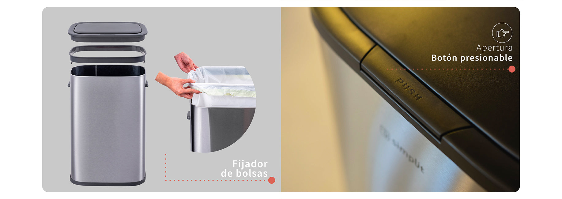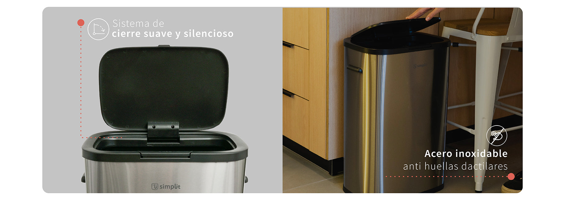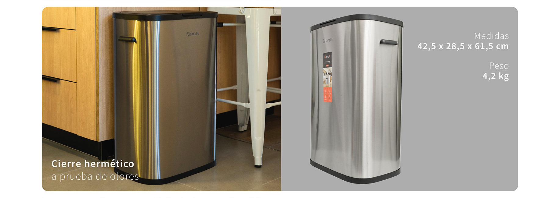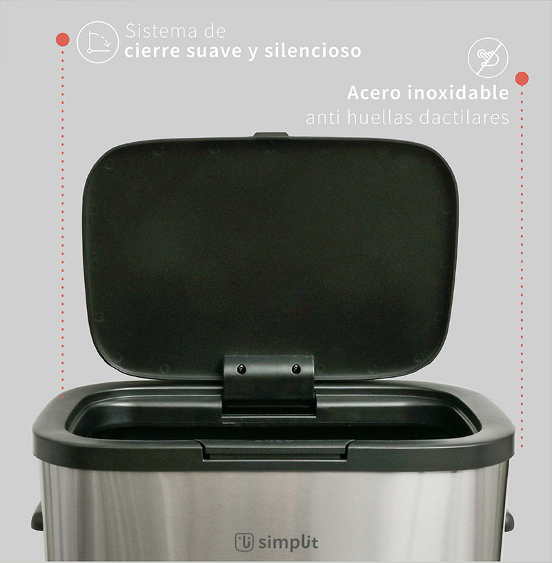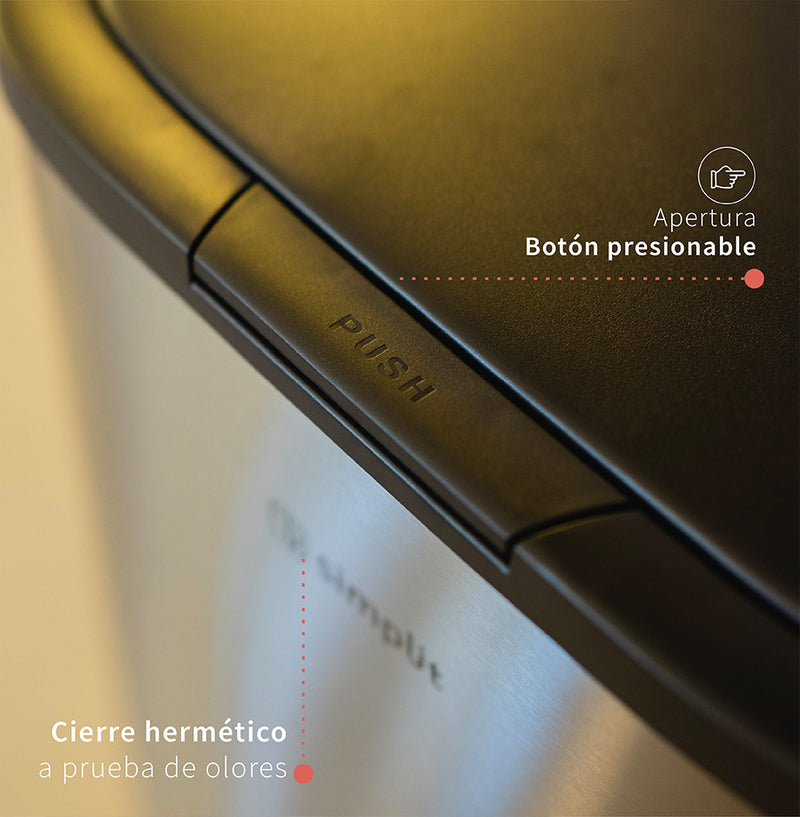 El basurero de cocina Simplit Handy de 55 litros combina estilo y funcionalidad en un diseño robusto. Está equipado con un botón presionable facilitando un acceso rápido y sencillo. Fabricado en acero inoxidable anti huellas dactilares, mantiene un aspecto limpio y elegante en todo momento. Su mecanismo de cierre suave y silencioso, junto con el sistema hermético que previene olores, lo hace ideal para cocinas, hoteles, restaurantes y oficinas. Simplit ofrece innovación y diseño superior para mantener tus espacios limpios y frescos.