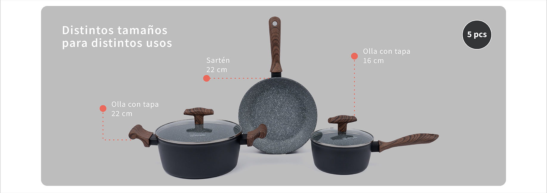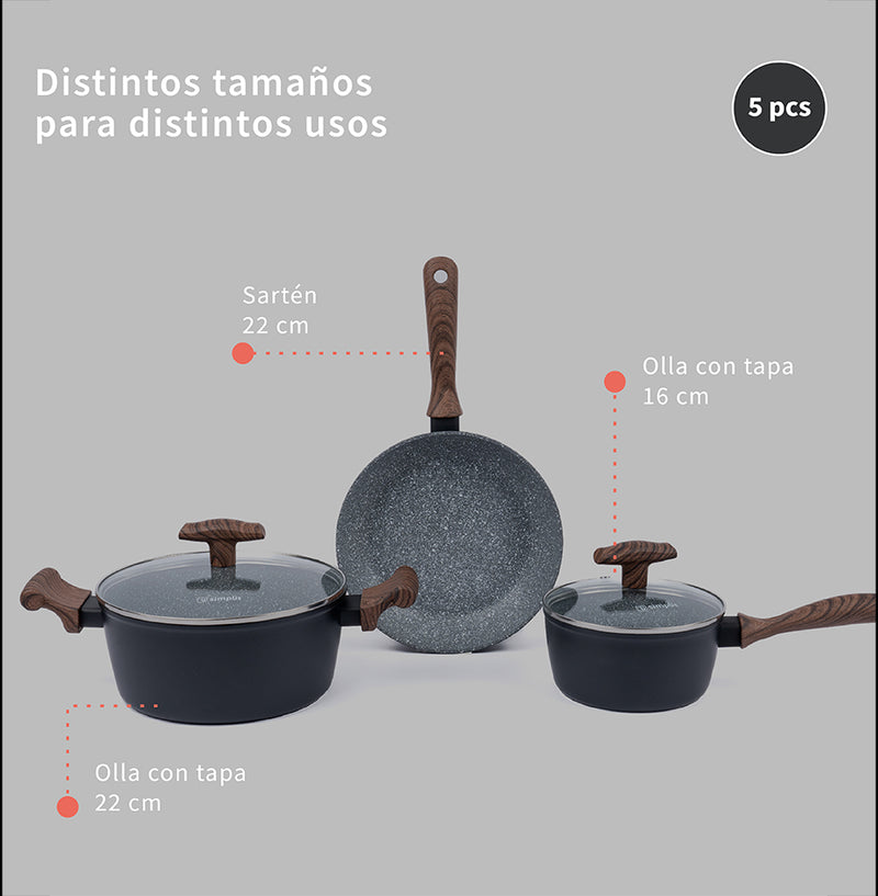 Cada pieza de esta batería está diseñada meticulosamente para brindarte la máxima satisfacción en la cocina. Las ollas de 22cm y 16cm, junto con el sartén de 22cm, te permiten cocinar una variedad de platos con facilidad. Ya sea que estés preparando una cena familiar o experimentando con tus recetas favoritas, estas ollas te respaldarán en cada paso.