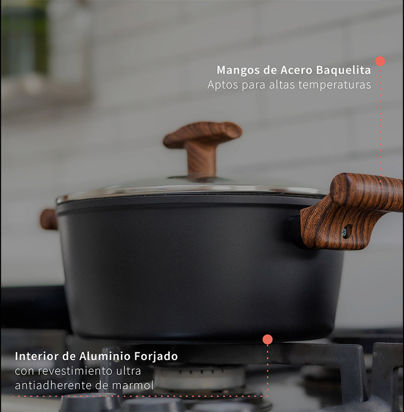 • Material Exterior: Aluminio Forjado, resiste altas temperaturas (Max. 220°C), Color Negro Mate