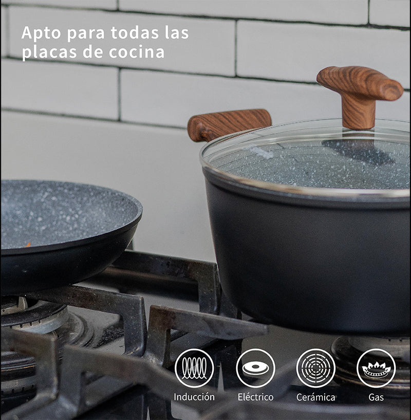El material de Aluminio Forjado de alta calidad con un revestimiento de mármol ultra antiadherente garantiza que tus comidas se cocinen de manera uniforme y sin que nada se quede pegado. No más preocupaciones por la limpieza, ya que estas ollas son muy fáciles de lavar.