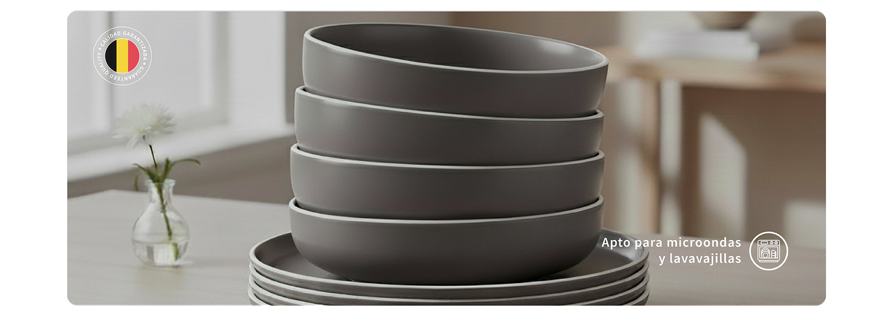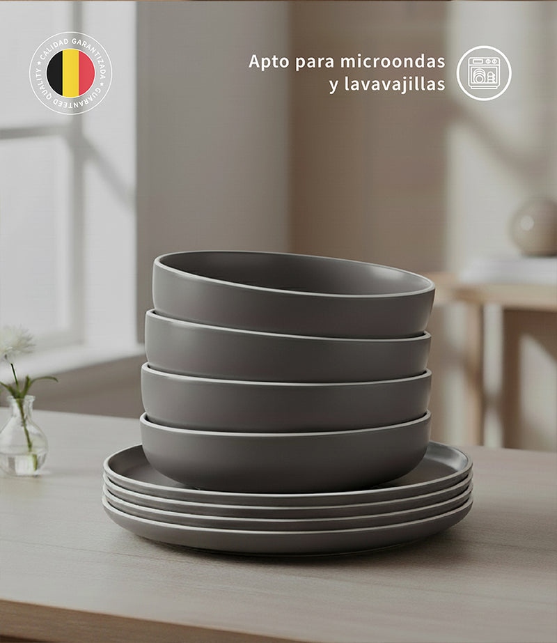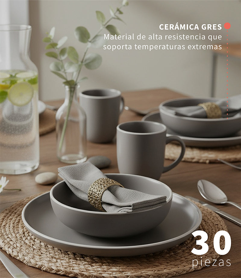 Eleva tus comidas con el estilo sobrio de Bruselas. Su tono gris mate y líneas limpias aportan elegancia contemporánea, mientras la cerámica gres ofrece la durabilidad ideal para el uso diario o para recibir invitados. Un set completo para 6 personas que combina diseño, practicidad y consistencia en cada pieza.