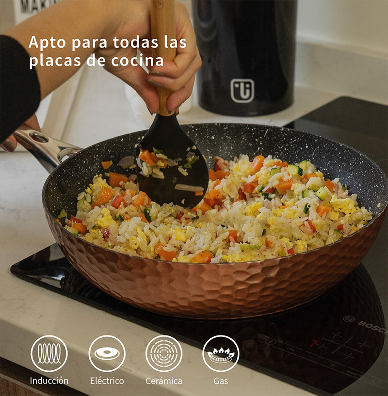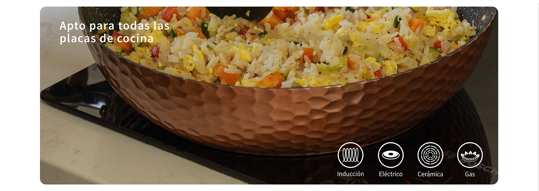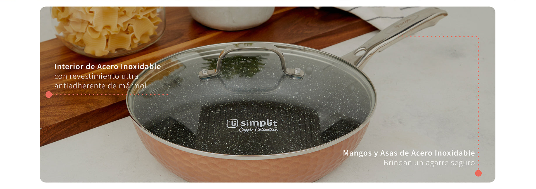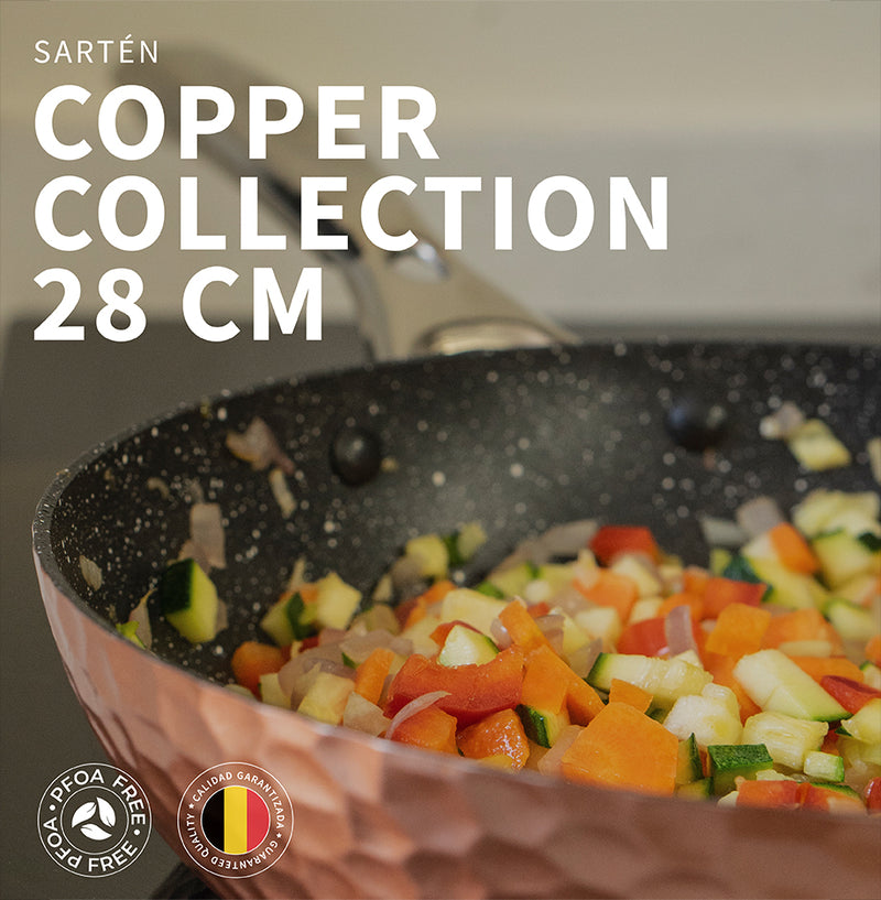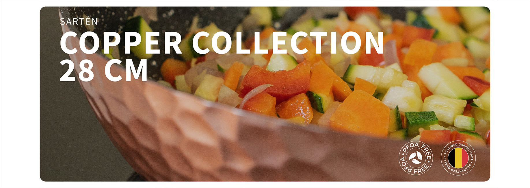 Copper Collection está cuidadosamente diseñada para entregarte un producto duradero, con un hermoso acabado martillado que agrega un toque de calidez y elegancia a la cocina. Diseñada con un sistema de proporción para una distribución uniforme del calor, con un revestimiento antiadherente sin plomo ni cadmio para una cocina más saludable.