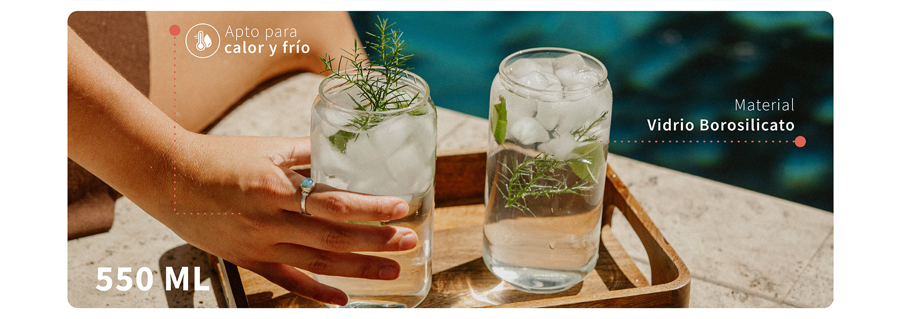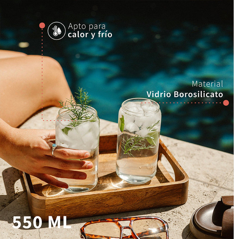 Hechos de vidrio borosilicato que los hace más resistentes y aptos para bebidas frías y calientes.