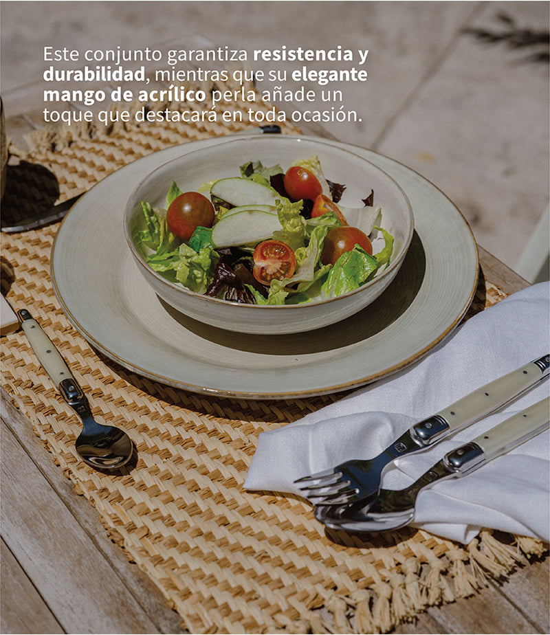 Renueva tu mesa con el Pack Doble Set de Cuchillería Versalle de Simplit, un conjunto diseñado para quienes buscan combinar estilo y funcionalidad. Fabricado en acero inoxidable de alta calidad, este set garantiza resistencia y durabilidad, mientras que su elegante mango de acrílica perla aporta un toque sofisticado y cómodo. Perfecto para el uso diario o eventos especiales, su diseño refinado se adapta a cualquier estilo de mesa.