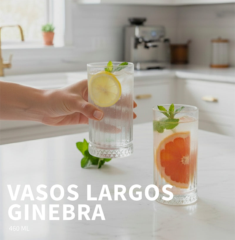 6 Vasos Largos (460ml): Con una capacidad generosa y silueta estilizada, son perfectos para tragos largos, Gin Tonics, mojitos, jugos refrescantes o bebidas heladas.