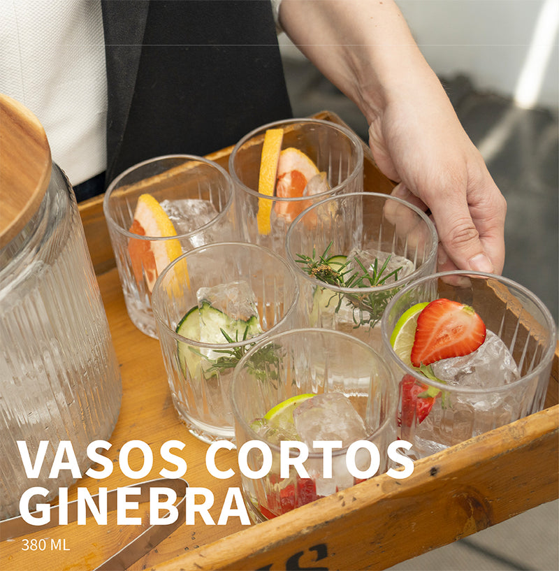 6 Vasos Cortos (380ml): De estilo Old Fashioned, son la elección ideal para whiskies, licores con hielo, agua fresca con rodajas de cítricos o incluso para presentar postres individuales con un toque elegante.