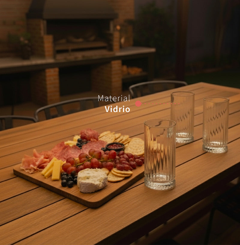 Cada vaso destaca por su cautivadora textura estriada vertical y una base robusta con patrón grabado, diseñadas no solo para un agarre seguro, sino para capturar y refractar la luz de manera espectacular en tu mesa.